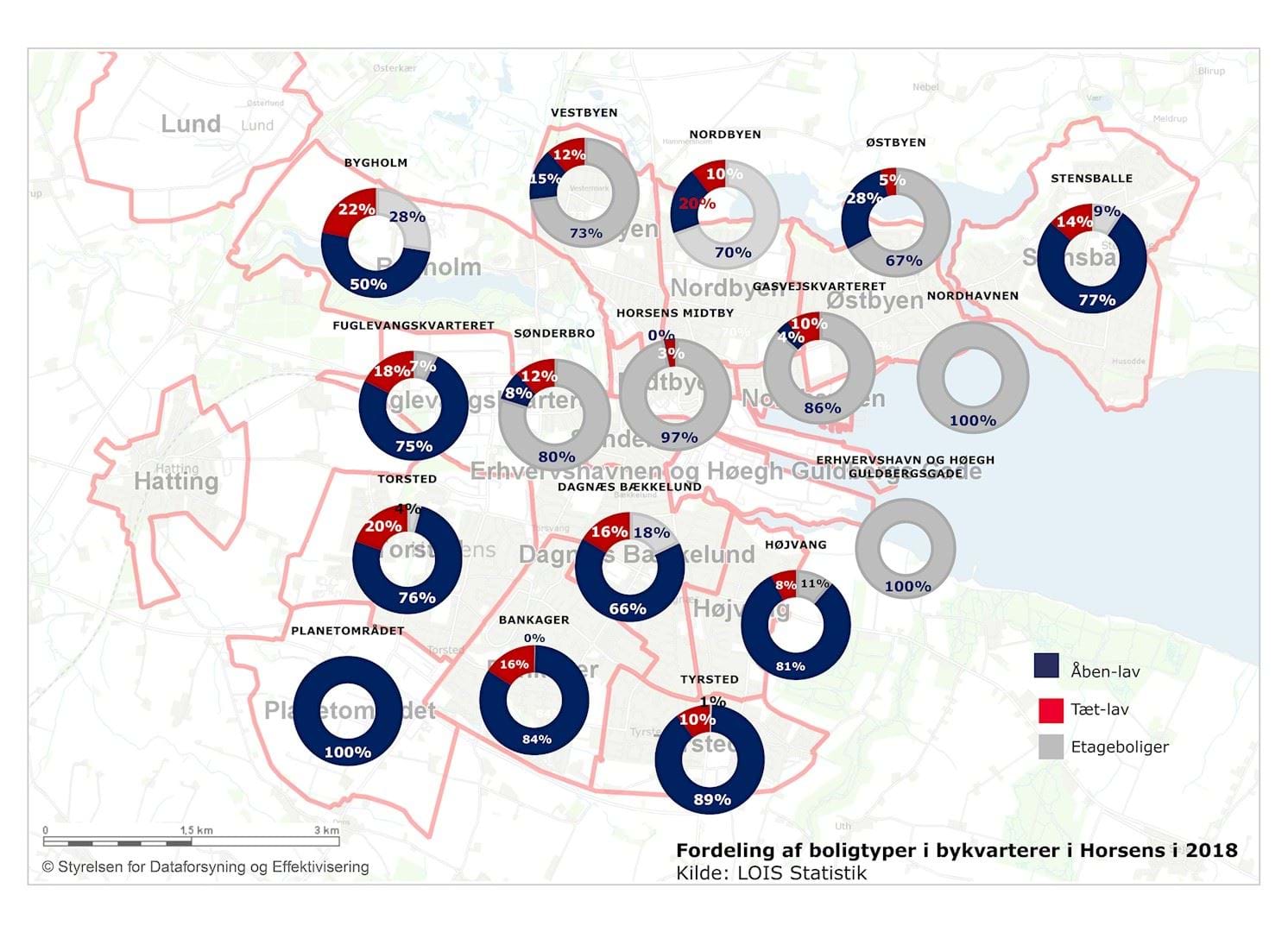 Ser man på bykvartererne i Horsens, er det tydeligt, at der i den centrale del af byen er flest etageboliger. I den syd-vestlige del af byen og i Stensballe er åben-lav boligerne til gengæld dominerende.
