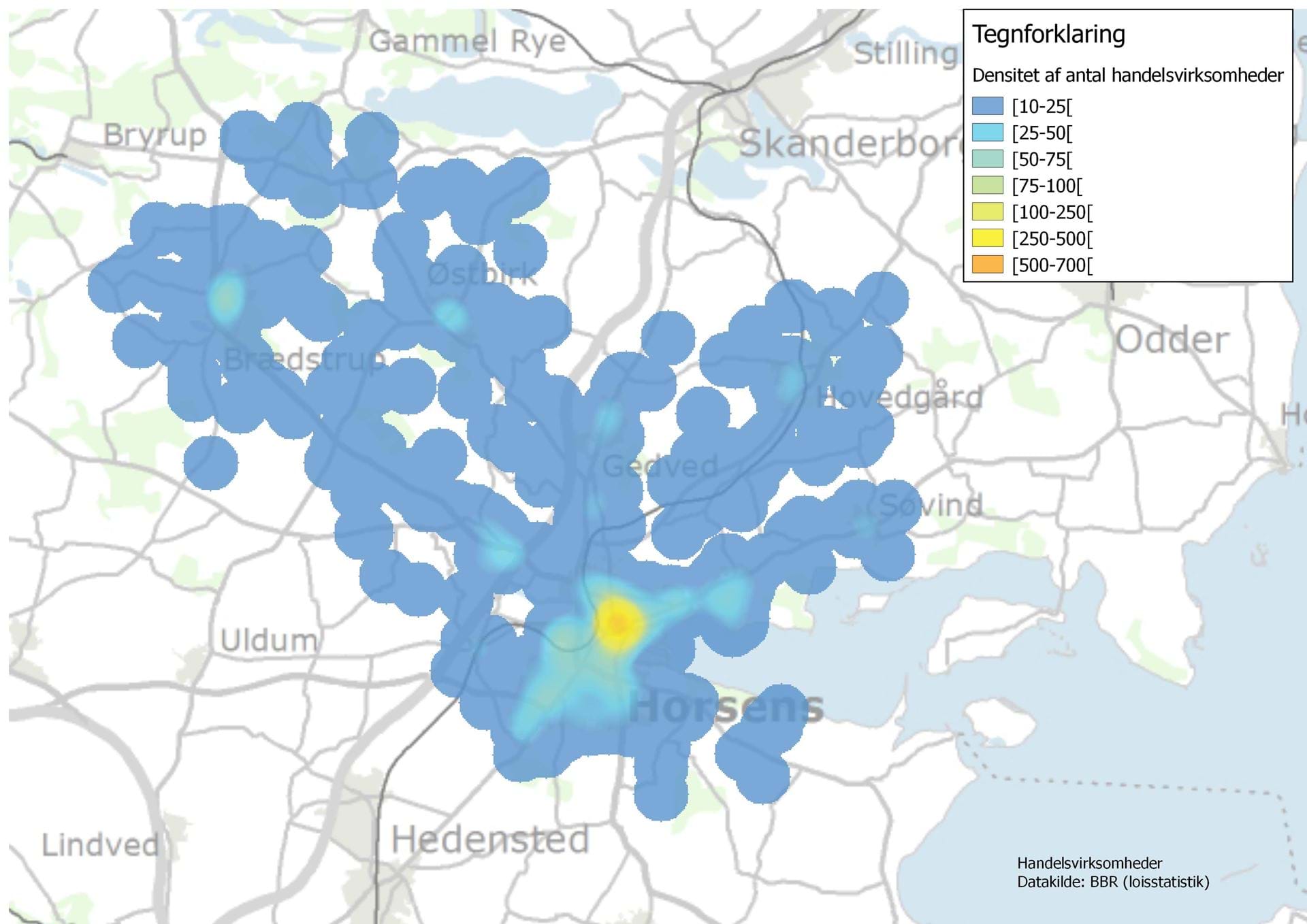 Virksomhederne, der beskæftiger sig med handel, ligger primært i Horsens, Brædstrup og lokalcenterbyerne. Der ligger dog en del enkeltbeliggende virksomheder spredt ud over kommunen.