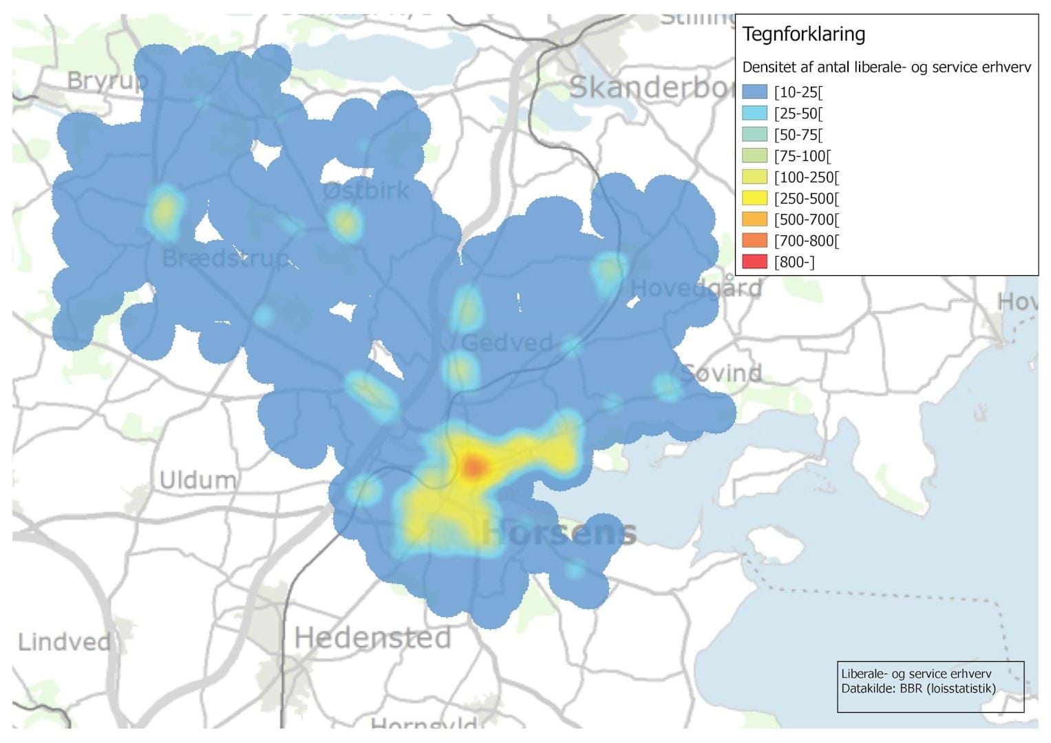 Placeringen af liberale erhverv og servicevirksomheder ligner virksomhederne indenfor kategorien Transport, forsyning, industri og byggeri. Virksomhederne ligger spredt over hele kommunen, dog med størst koncentration omkring Horsens, Brædstrup og lokalcenterbyerne.