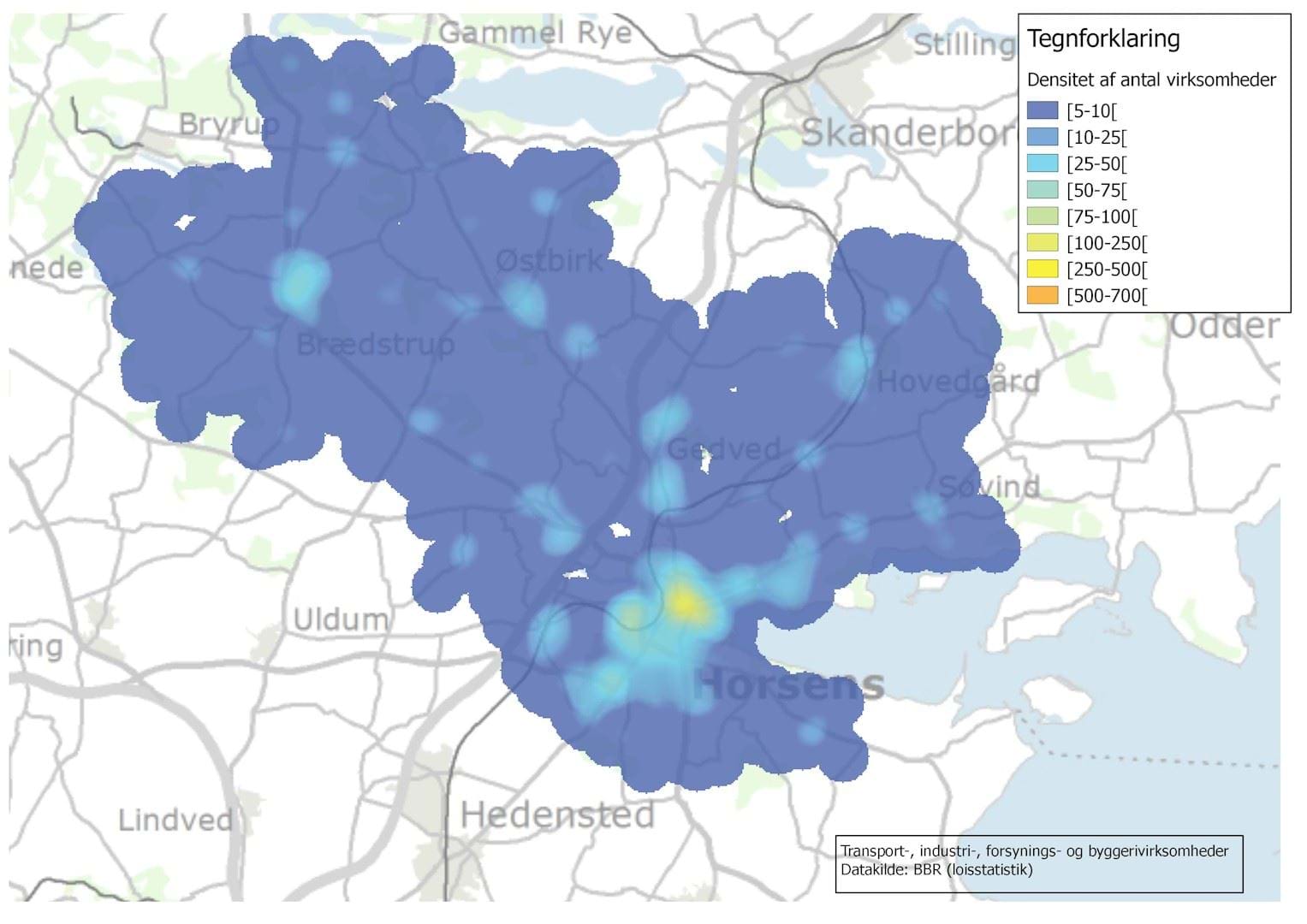 Virksomhederne indenfor kategorien Transport, forsyning, industri og byggeri ligger spredt over hele kommunen, dog med størst koncentration omkring Horsens, Brædstrup og lokalcenterbyerne.