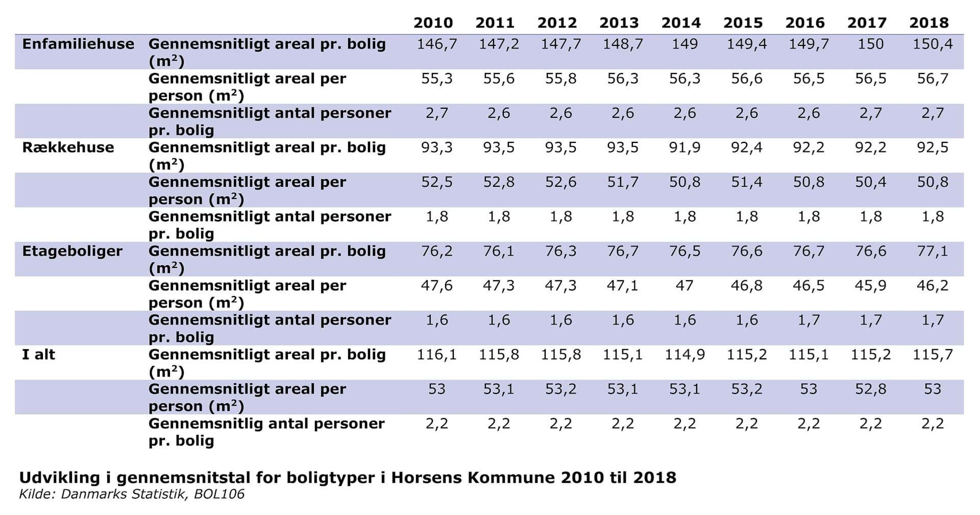 Det gennemsnitlige enfamiliehus er vokset i areal i perioden 2010 til 2018. Det gennemsnitlige antal personer pr. enfamiliehus ligger relativt fast i perioden. Det betyder, at den enkelte person har fået mere plads.