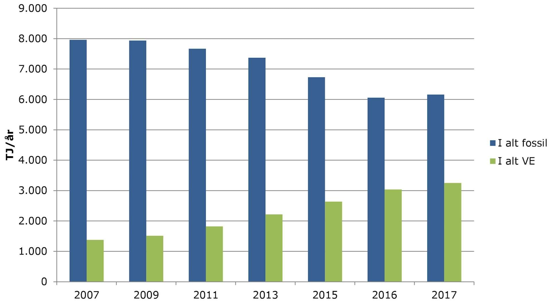 Udvikling i bruttoenergiforbrug opdelt på VE og fossile brændsler, Horsens Kommune. Energiregnskab 2017 for Region Midt, Planenergi