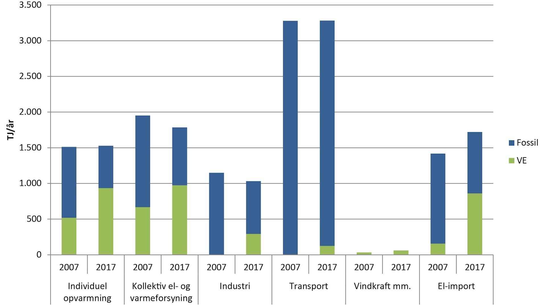 Ser man på udviklingen i CO2-udledningen fra basisåret 2007 til 2017, er det mindste fald i udledningen sket på transportområdet. Samtidig er det også transportområdet, der står for den mindste udfasning af fossile brændstoffer fra basisåret 2007 til 2017.