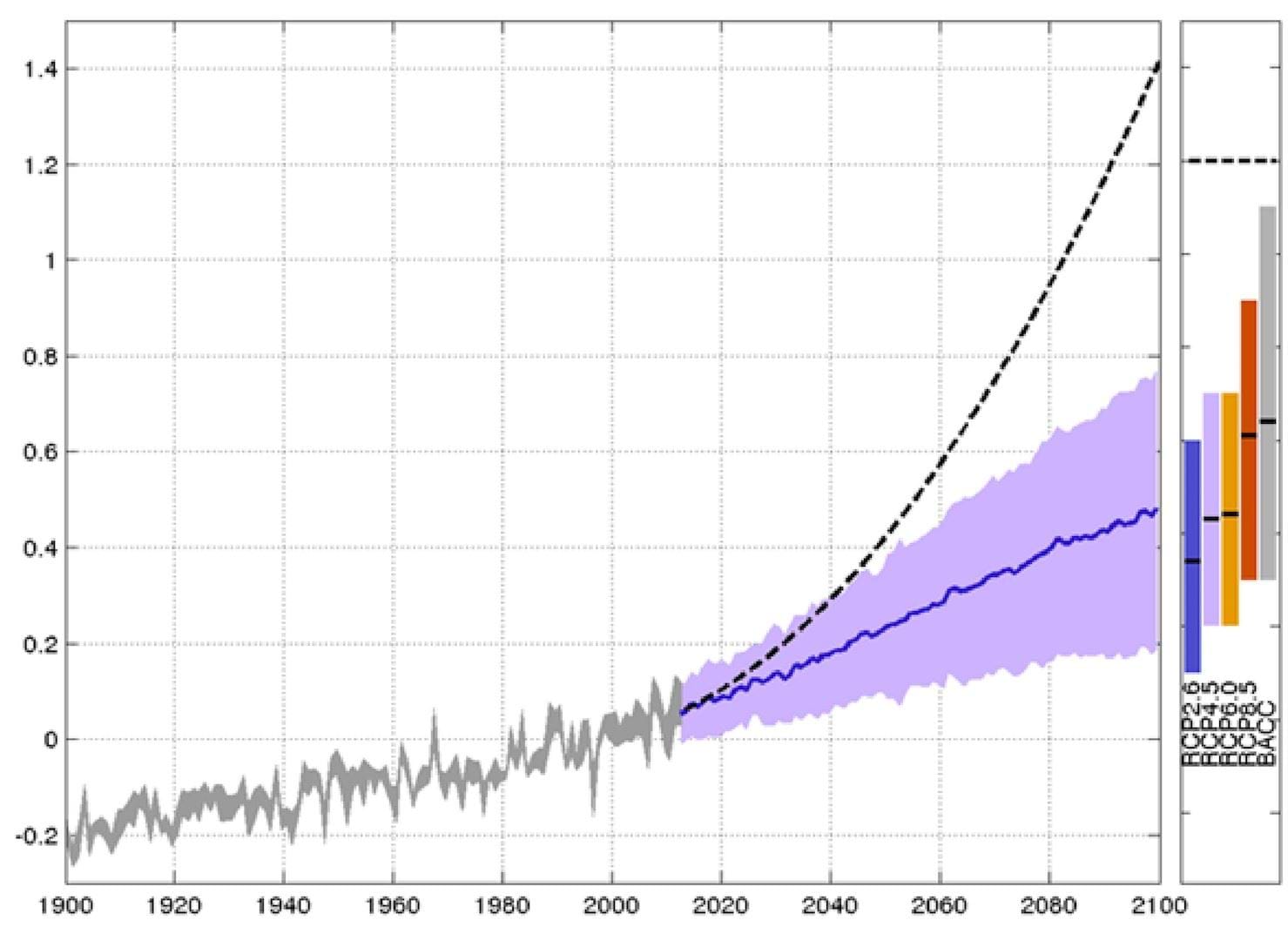 Figuren herover viser den gennemsnitlige målte globale havvandstand i perioden 1900 til 2015. Fra 2015 og frem til 2100 er vist den forventede globale havvandstand på baggrund af FN’s fem klimamodeller. Med stiplet linje er vist DMI’s forventning til maksimal stigning.